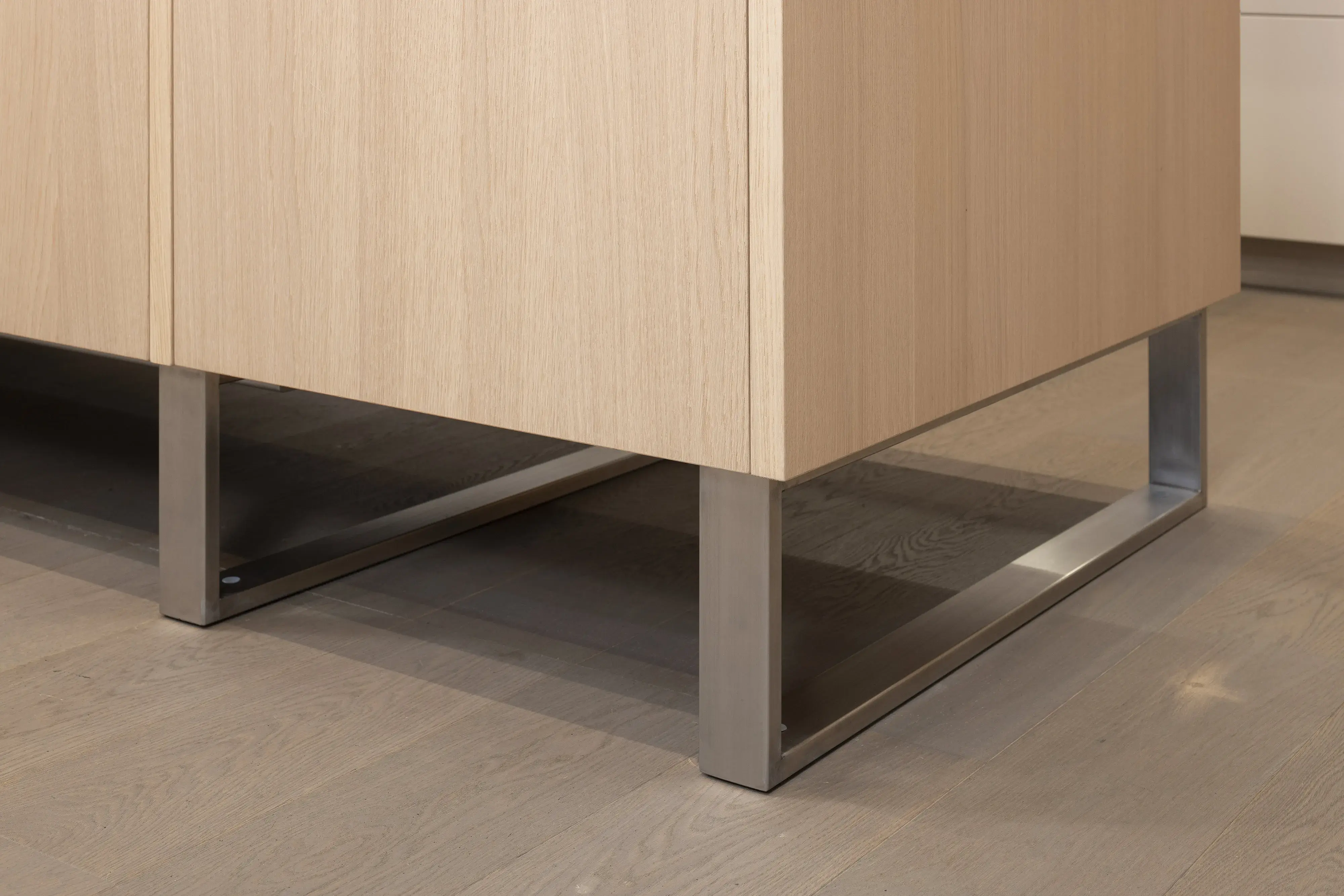 Eine neuere Bauform, die man mittlerweile bei einigen Küchenherstellern wählen kann, besteht in einem Metallsockel. Es handelt sich um ein sehr stabiles Sockelgestell aus Aluminium, das in unterschiedlichen Höhen erhältlich ist, auf welches die Kücheninsel aufgelegt wird. Diese Kombination nimmt Unterschränken augenblicklich ihre Wuchtigkeit, verleiht ihnen stattdessen etwas Edles und damit auch mehr den Charakter stilvoller Wohnmöbel. Alternativ zum Metallsockel stehen auch schlanke Metallfüße zur Wahl – je nach Wunsch in runder oder keilförmiger Ausführung.