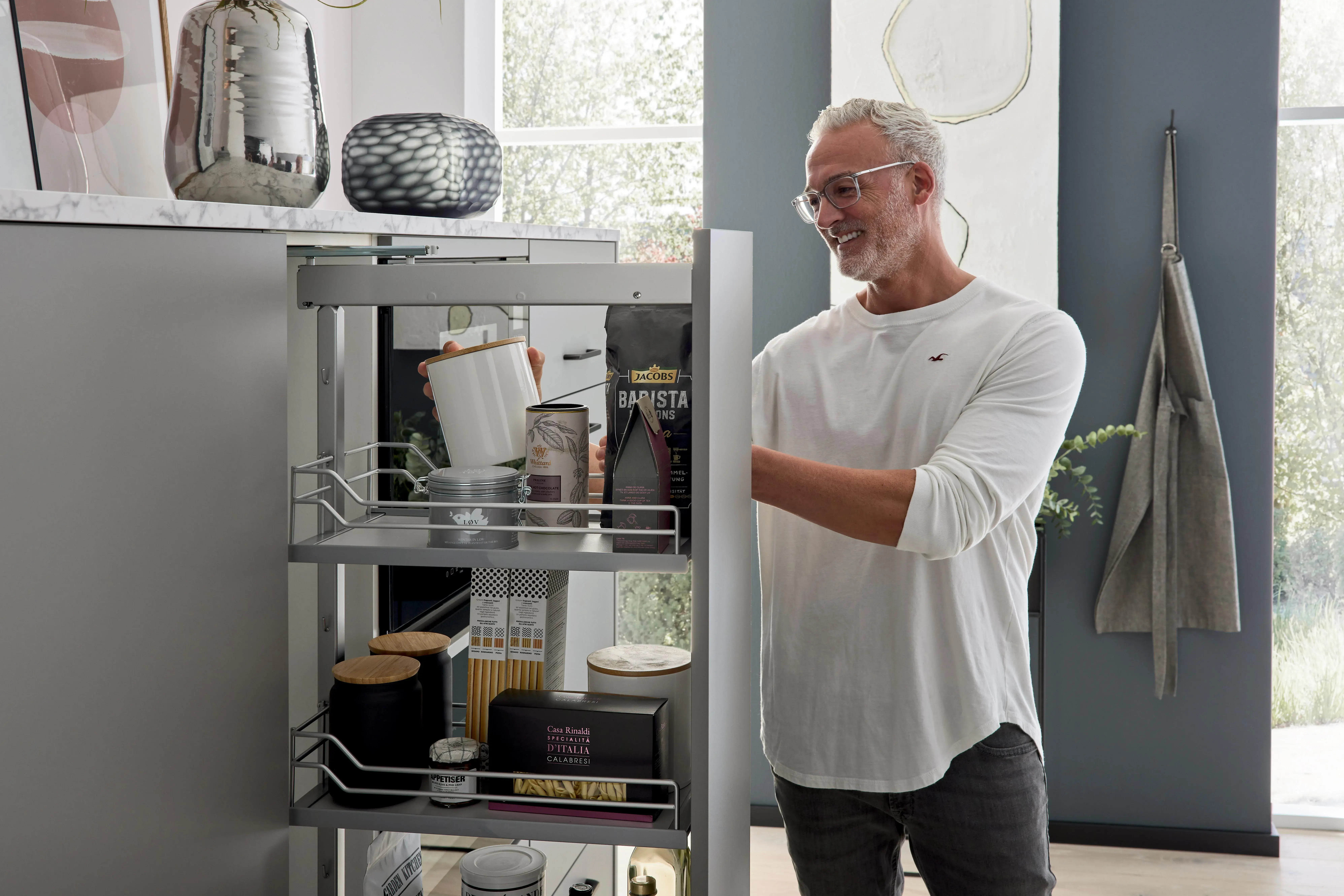Seitenschränke mit flexiblen Organisationssystemen garantieren Stauraum nach Maß. Apothekerauszüge bieten Übersichtlichkeit und Bedienkomfort von beiden Seiten. Nahezu lautlos gleiten sie aus dem Schrank, denn in puncto Technik setzt Impuls auf geprüfte Markenqualität. Dank des integrierten Komforteinzugs schließen sich Auszüge selbstständig und flüsterleise dank der mit integrierten Dämpfungselemente. Die serienmäßigen Marken-Clipscharniere sind dreidimensional verstellbar.