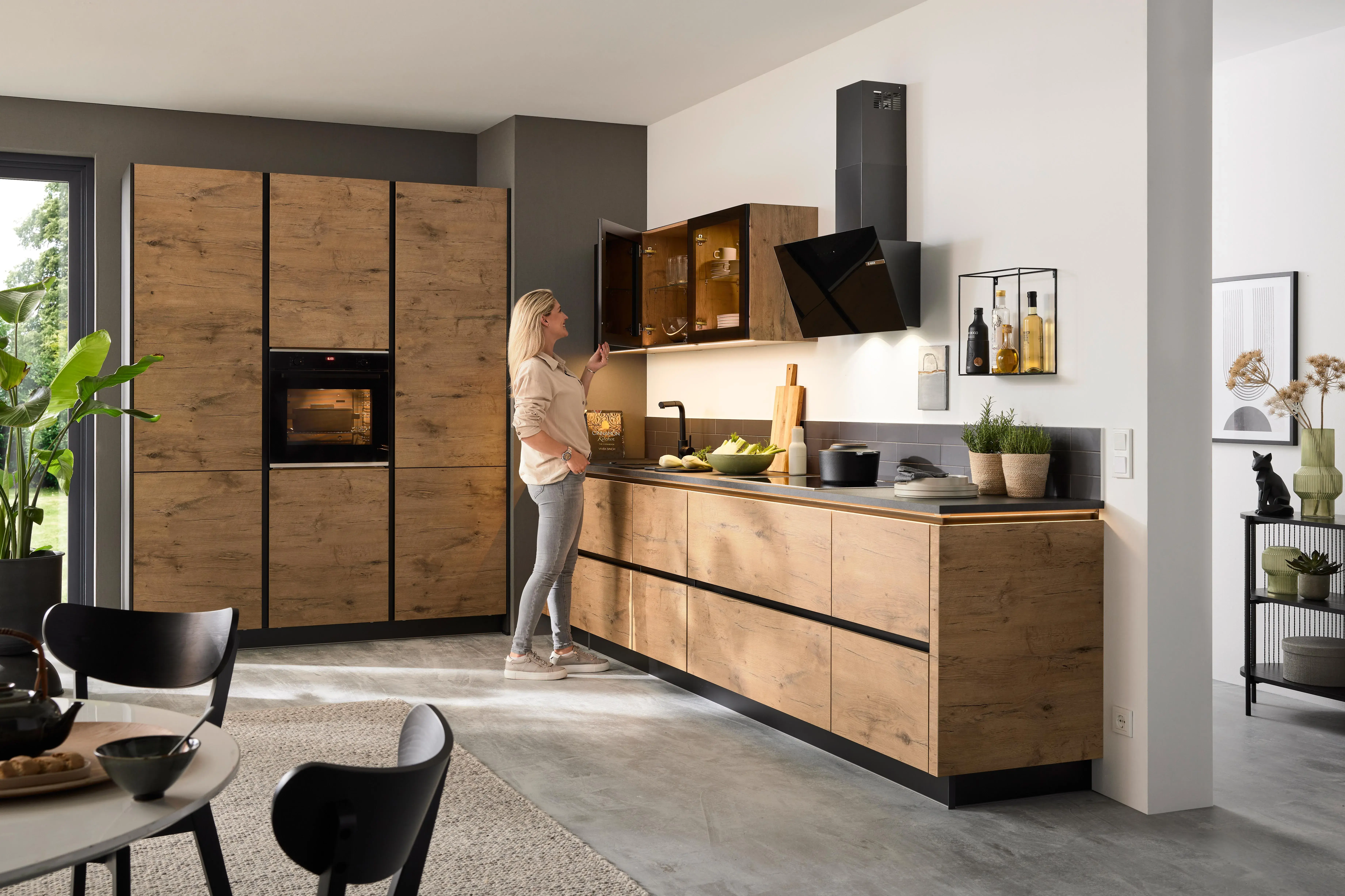 So wirkt optisch alles wie aus einem Guss. Wenn Sie sich für eine grifflose Küche entscheiden, beweisen Sie Ihr Stilbewusstsein für eine klare Linienführung. Impuls bietet dafür neue Frontenfarben, darunter Vulkanbraun, Schiefergrau, und Alby Blue mit passenden Wangen und gleichfarbigem Sockel. Matt und glänzend lässt sich toll kombinieren. Bei Impuls bekommen Sie jedoch auch Holzoptik vom Feinsten: Ob Seeahorn, Vintage-Eiche, Oregon-Eiche, Eiche hell oder Eiche Schwarz – die Impuls Dekore vereinen die natürliche Ästhetik von Holz mit der Strapazierfähigkeit pflegeleichter Oberflächen. Und in welcher Richtung die Maserung verlaufen soll – vertikal oder horizontal – bestimmen Sie! Seitenschränke mit flexiblen Organisationssystemen garantieren Stauraum nach Maß. Apothekerauszüge bieten Übersichtlichkeit und Bedienkomfort von beiden Seiten. Nahezu lautlos gleiten sie aus dem Schrank, denn in puncto Technik setzt Impuls auf geprüfte Markenqualität. Dank des integrierten Komforteinzugs schließen sich Auszüge selbstständig und flüsterleise. Die serienmäßigen Marken-Clipscharniere sind dreidimensional verstellbar.